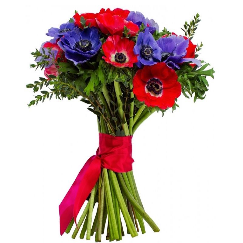 Букет состоит из 10 красных анемонов, 9 синих анемонов, зелень, прозрачная упаковка, атласная лента.