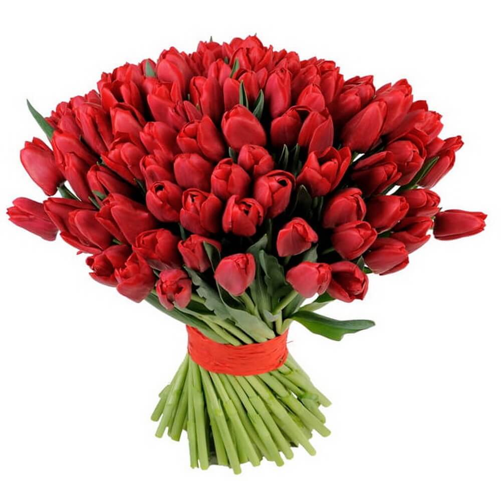 Букет состоит из 101 красный тюльпан, прозрачная упаковка, красная лента.