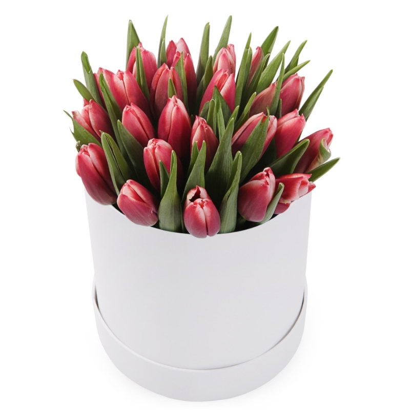 Букет состоит из 25 красных тюльпанов, коробка, оазис.