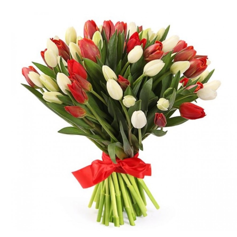 Букет состоит из 26 красных тюльпанов, 25 белых тюльпанов, атласная лента.