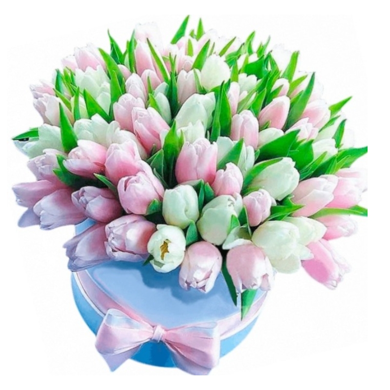 Букет состоит из 26 белых тюльпанов, 25 розовых тюльпанов, коробка, атласная лента, оазис.