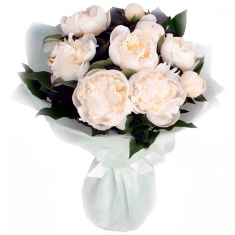 Букет состоит из 9 белых пионов, салал, красивая упаковка, атласная лента.