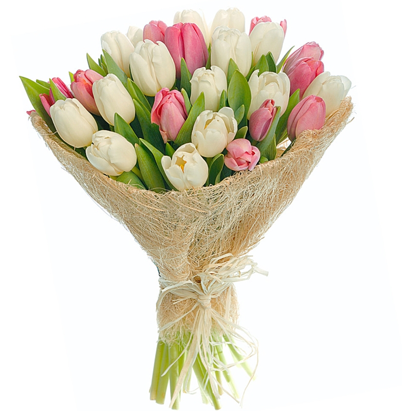 Букет состоит из 16 белых тюльпанов, 15 розовых тюльпанов, красивая упаковка, атласная лента.