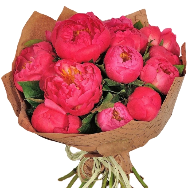 Букет состоит из 11 пионов, крафт, атласная лента.