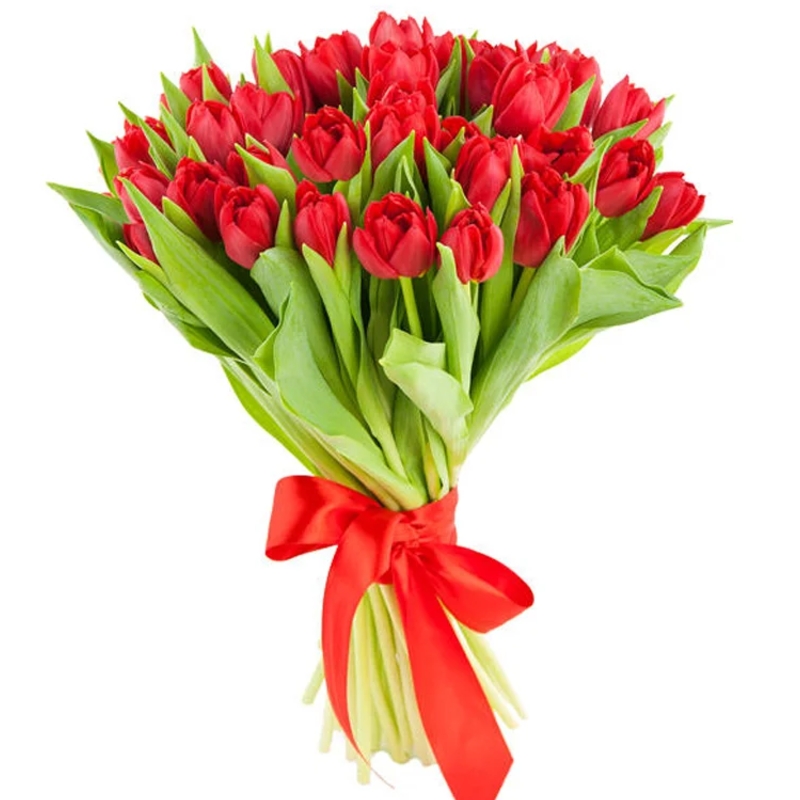 Букет состоит из 29 красных тюльпанов, прозрачная упаковка, атласная лента.