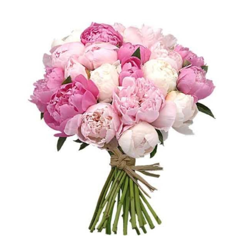 Букет состоит из 25 розовых пионов, прозрачная упаковка, розовая лента.