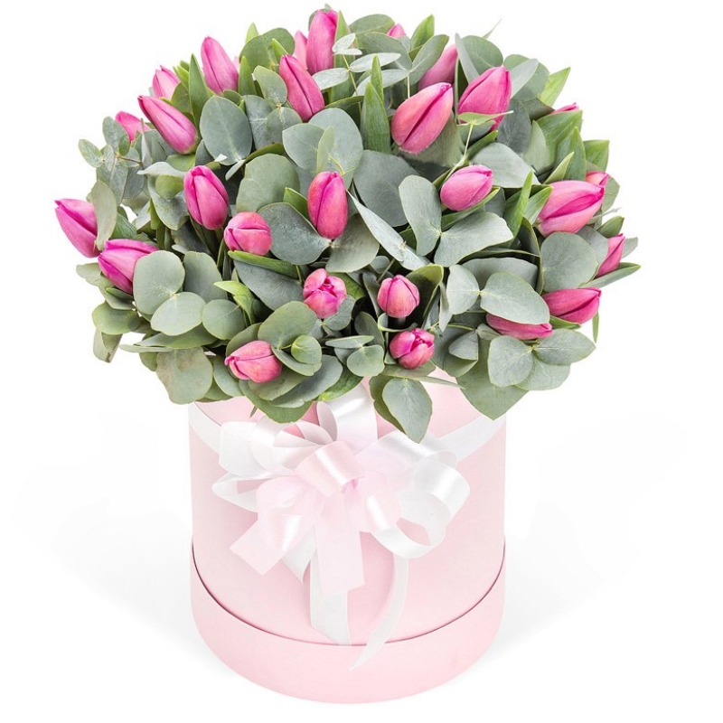 Букет состоит из 45 тюльпанов, эвкалипт, коробка, атласная лента, оазис.