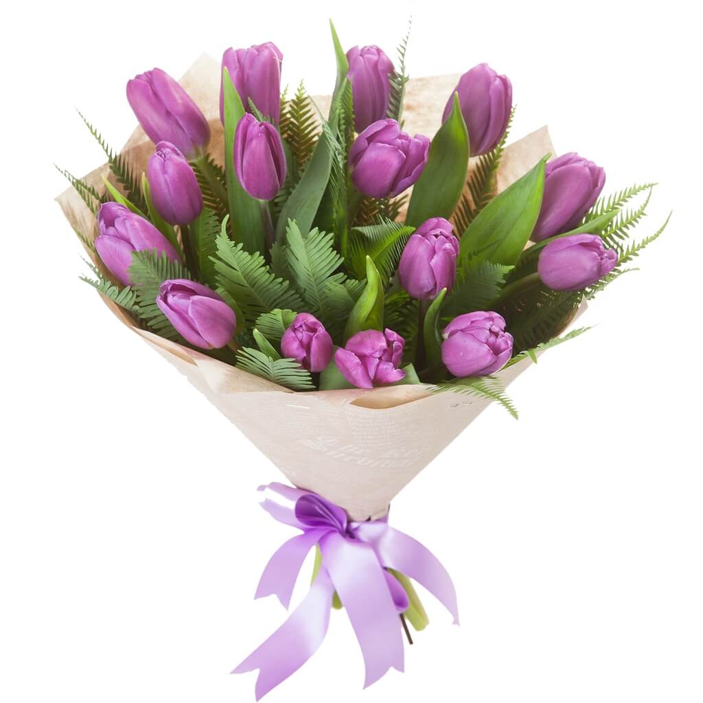Букет состоит из 15 сиреневых тюльпанов, зелень, крафт, атласная лента.