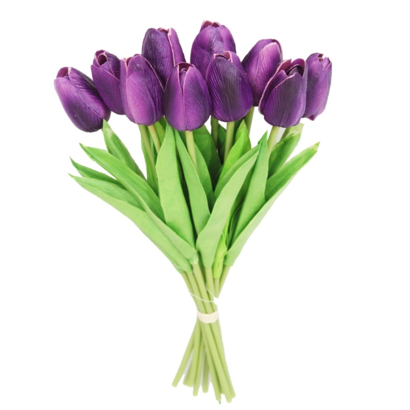 Букет состоит из 9 сиреневых тюльпанов, прозрачная упаковка, атласная лента.
