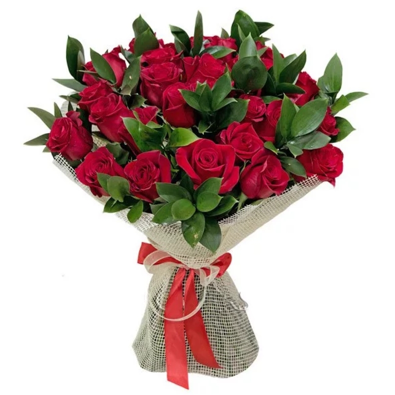 Букет состоит из 35 розовых роз, рускус, красивая упаковка, атласная лента.