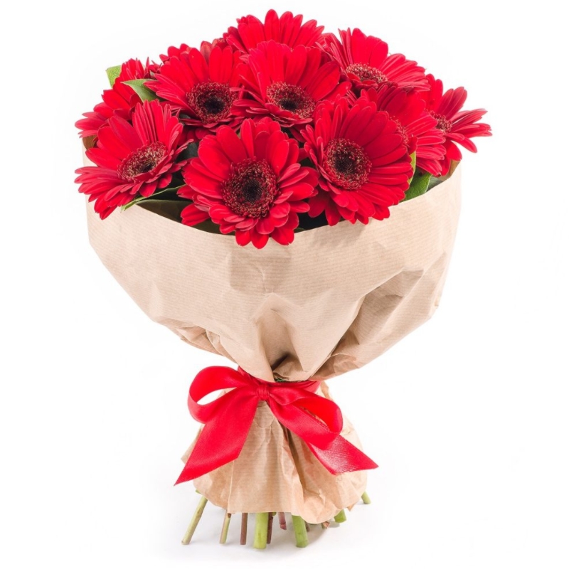 Букет состоит из 13 красных гербер, крафт, атласная лента.