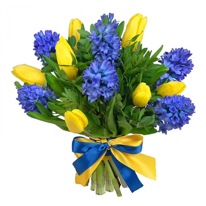 Букет состоит из 7 синих гиацинтов, 8 желтых тюльпанов, прозрачная упаковка, атласная лента.