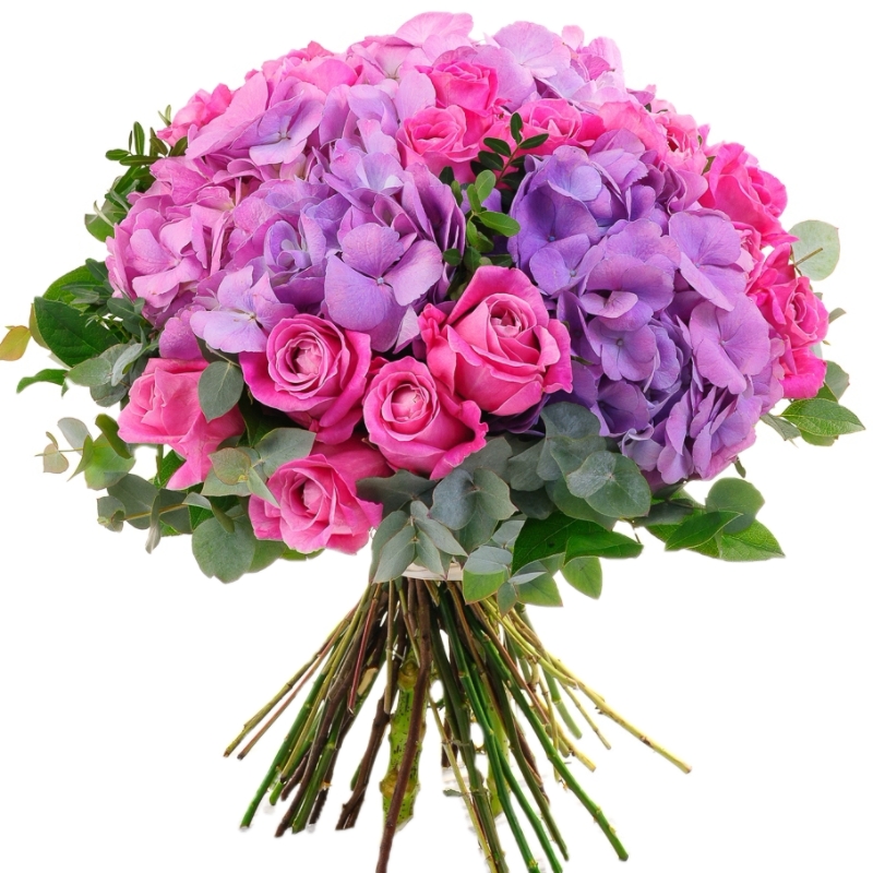 Букет состоит из 3 сиреневые гортензии, 16 розовых роз, зелень, прозрачная упаковка, атласная лента.