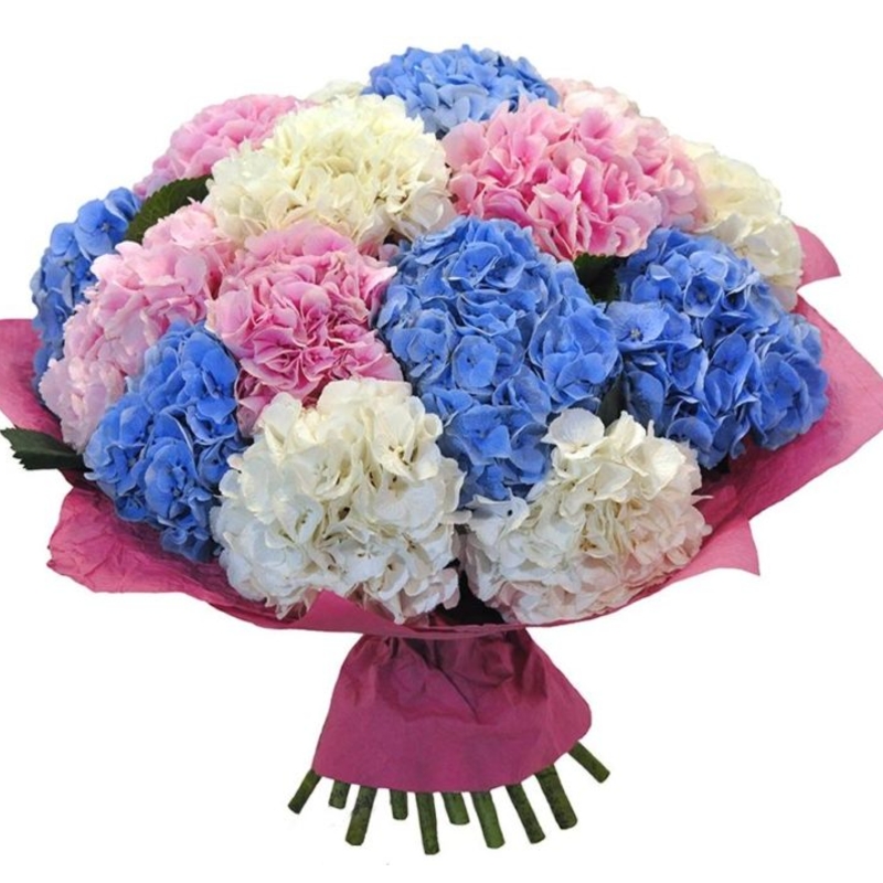 Букет состоит из MIX из 15 гортензий, крафт, атласная лента.