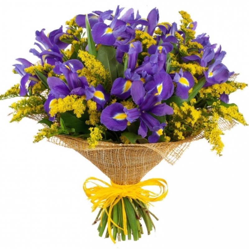 Букет состоит из 25 ирисов, 10 веток мимозы, красивая упаковка, атласная лента.