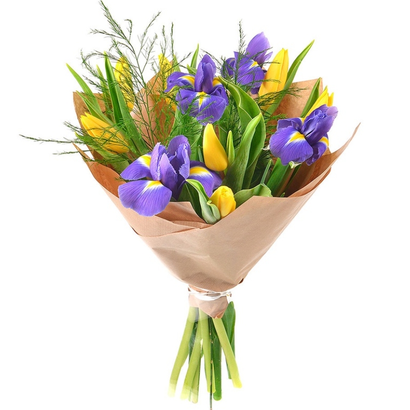Букет состоит из 7 желтых тюльпанов, 4 ириса, зелень, крафт, атласная лента.