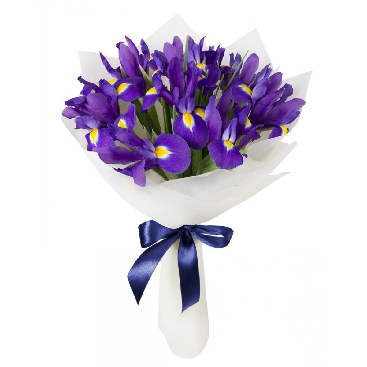Букет состоит из 21 ирис, белая упаковка, синяя лента.