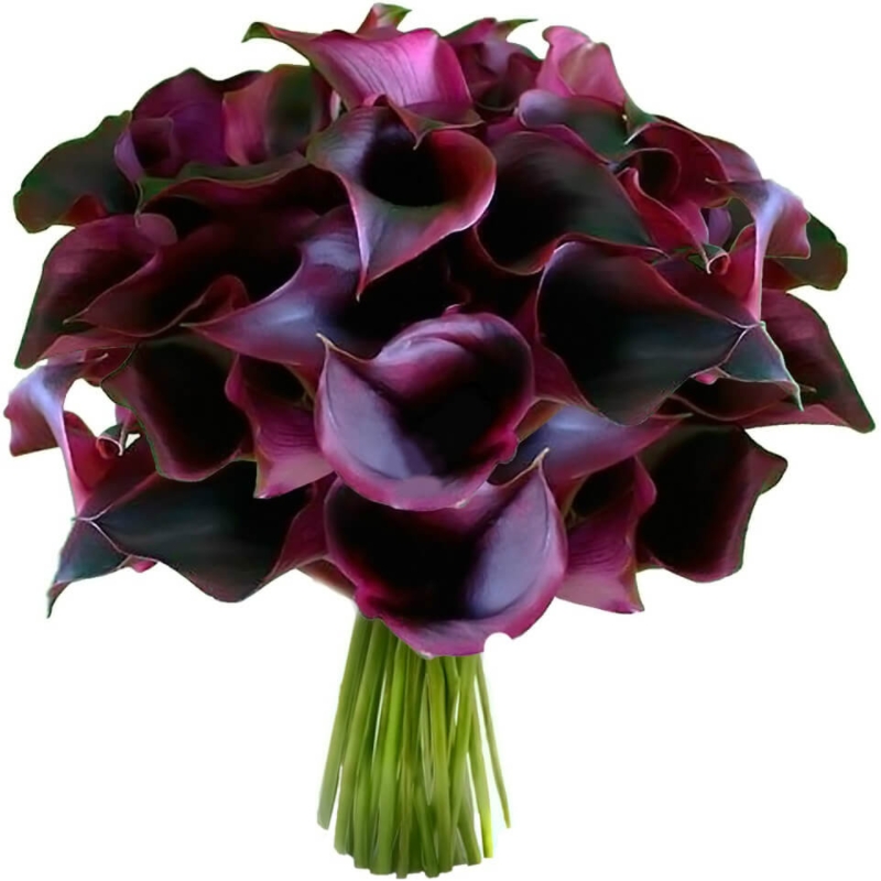 Букет состоит из 35 бордовых калл, прозрачная упаковка, атласная лента.