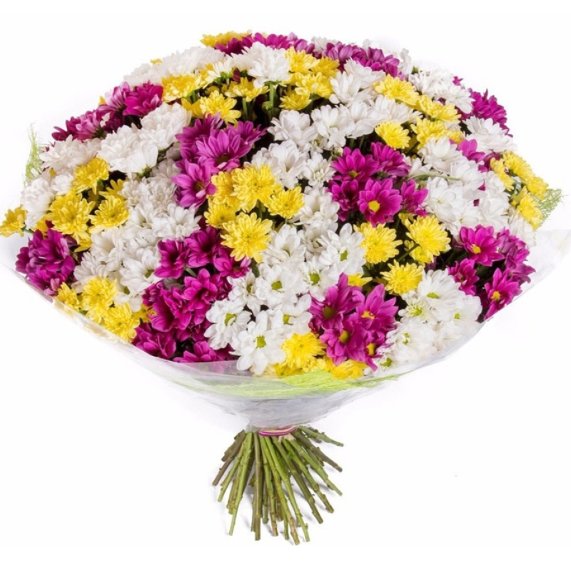 Букет состоит из MIX из 51 хризантемы, прозрачная упаковка, атласная лента.