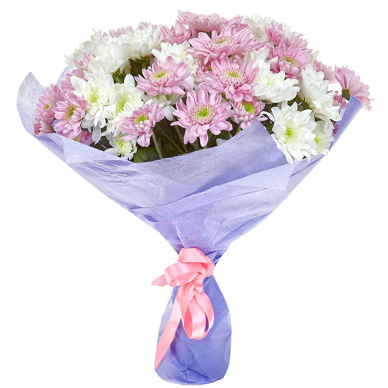 Букет состоит из 6 веток белой хризантемы, 5 веток розовой хризантемы, красивая упаковка, атласная лента.