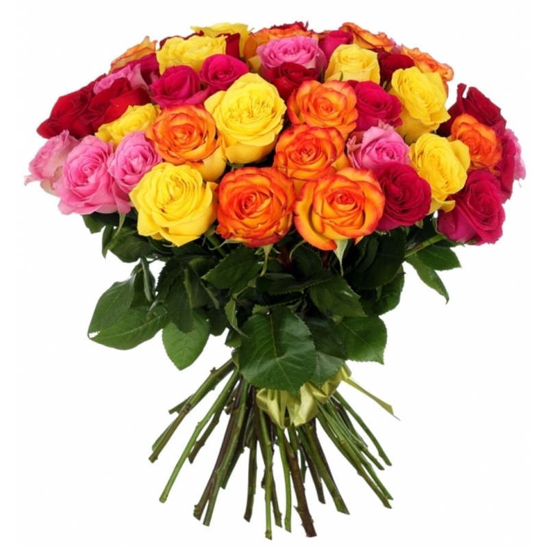 Букет состоит из MIX из 35 роз, прозрачная упаковка, атласная лента.
