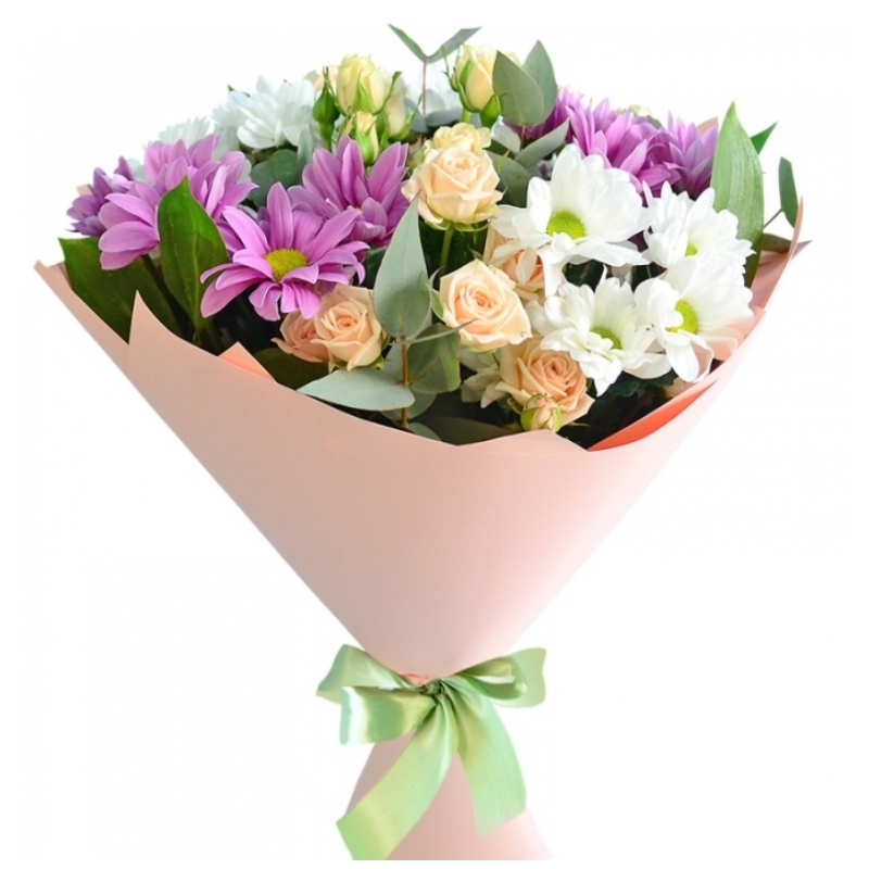 Букет состоит из 3 ветки кремовой розы, 8 веток хризантем, крафт, атласная лента.