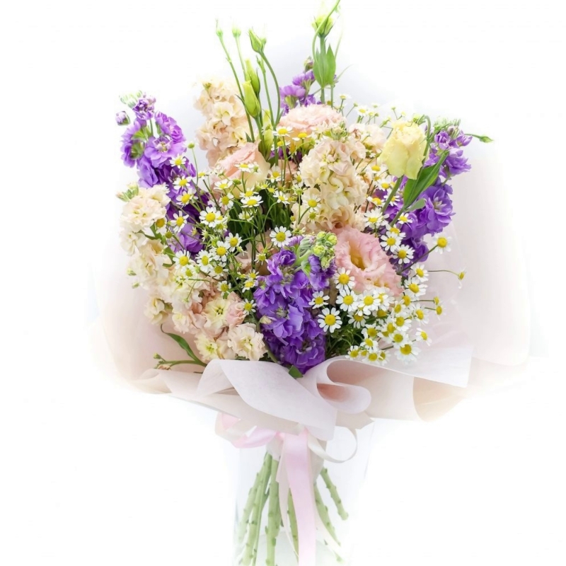 Букет состоит из 7 маттиол, 3 ветки эустомы, 3 ветки танацетума, красивая упаковка, атласная лента.