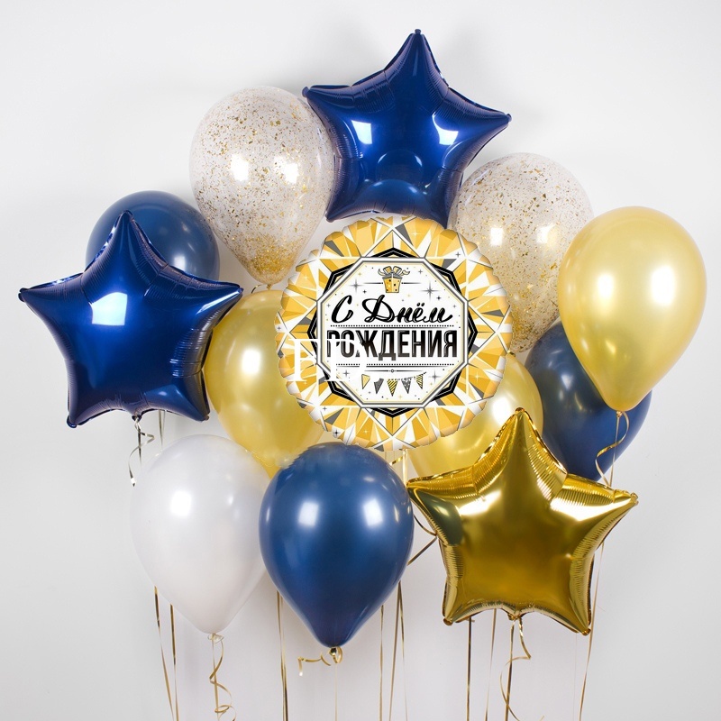 В состав фонтана входят 7 латексных шаров, 2 прозрачных шаров с конфетти, 3 фольгированные звезды и круглый шар.