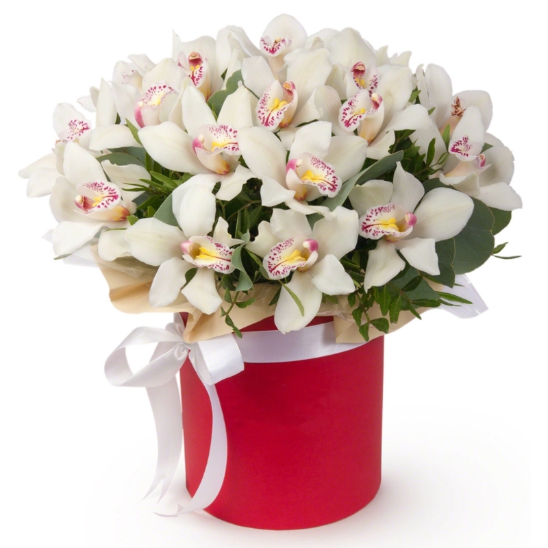 Букет состоит из 19 белых орхидей, зелень, коробка, оазис, атласная лента.