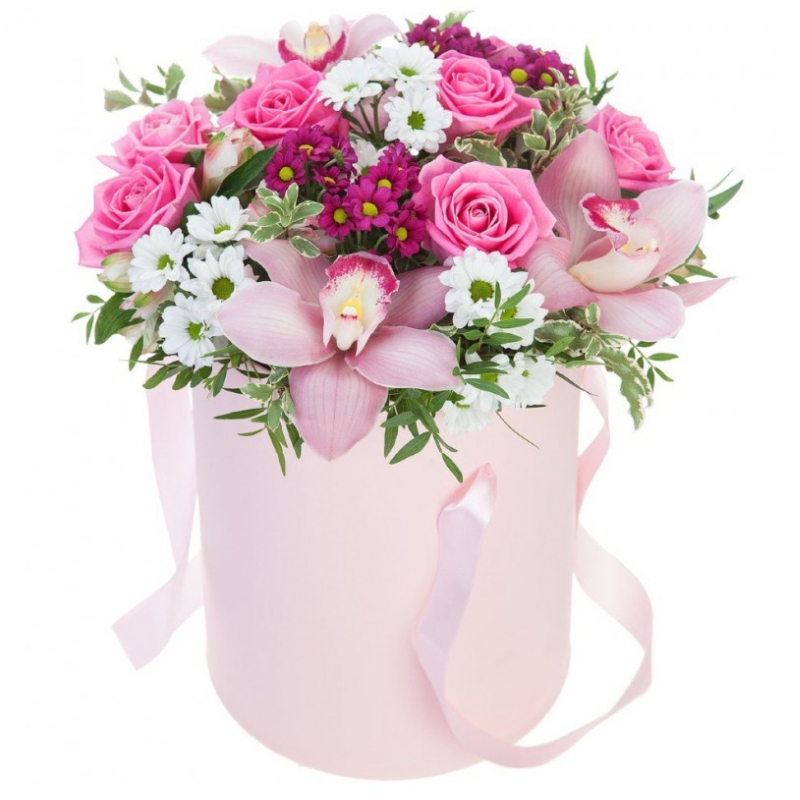 Букет состоит из 7 розовых роз, 3 орхидеи, 6 веток кустовой хризантемы, зелень, коробка, оазис.