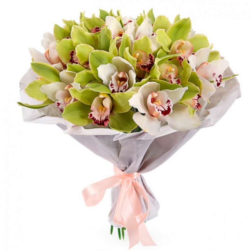 Букет состоит из 25 орхидей, красивая упаковка, атласная лента.
