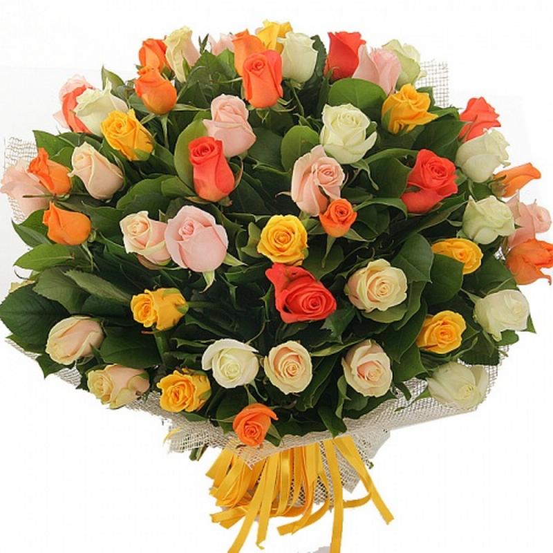 Букет состоит из MIX из 51 розы, сетка, атласная лента.