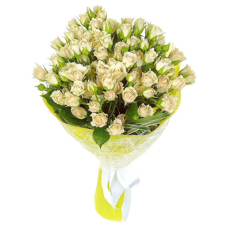 Букет состоит из 11 белых кустовых роз, зелень, красивая упаковка, атласная лента.
