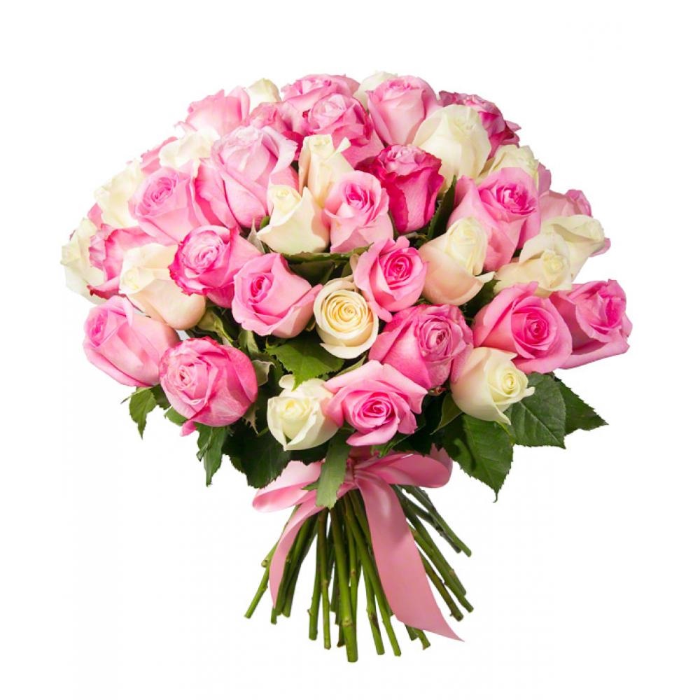 Букет состоит из 55 белых и розовых роз Кения, прозрачная упаковка, атласная лента.