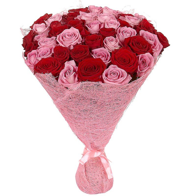 Букет состоит из 31 розовая роза, 20 красных роз, розовая упаковка, розовая или красная лента.