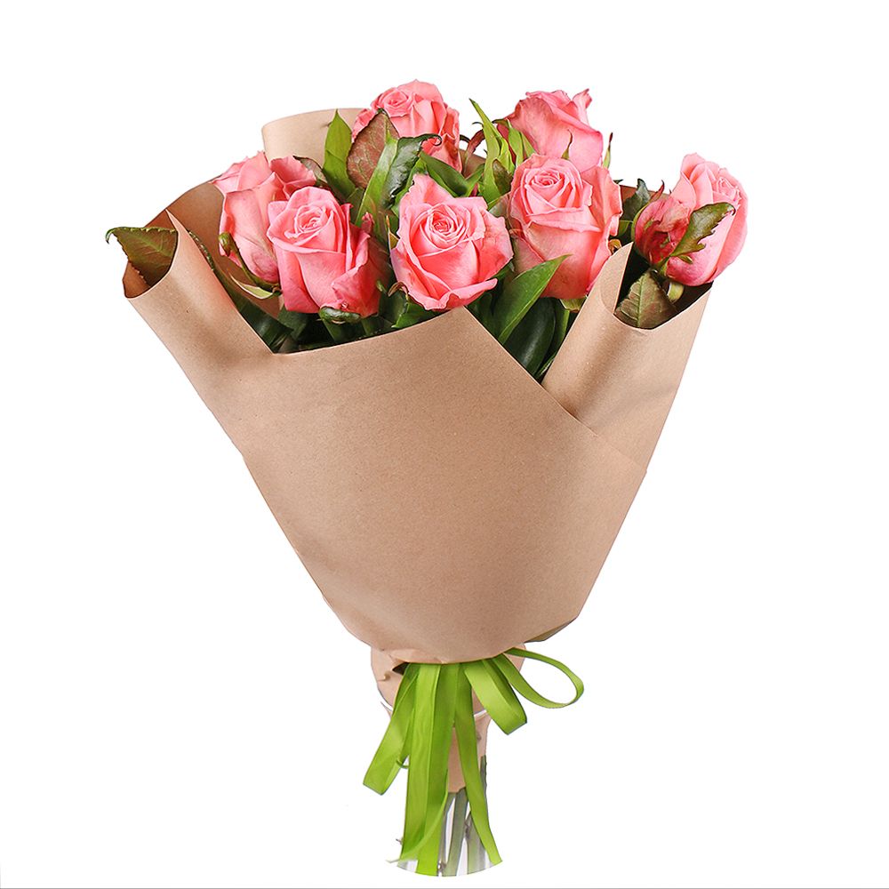 Букет состоит из 7 розовых роз, зелень, крафт, атласная лента.
