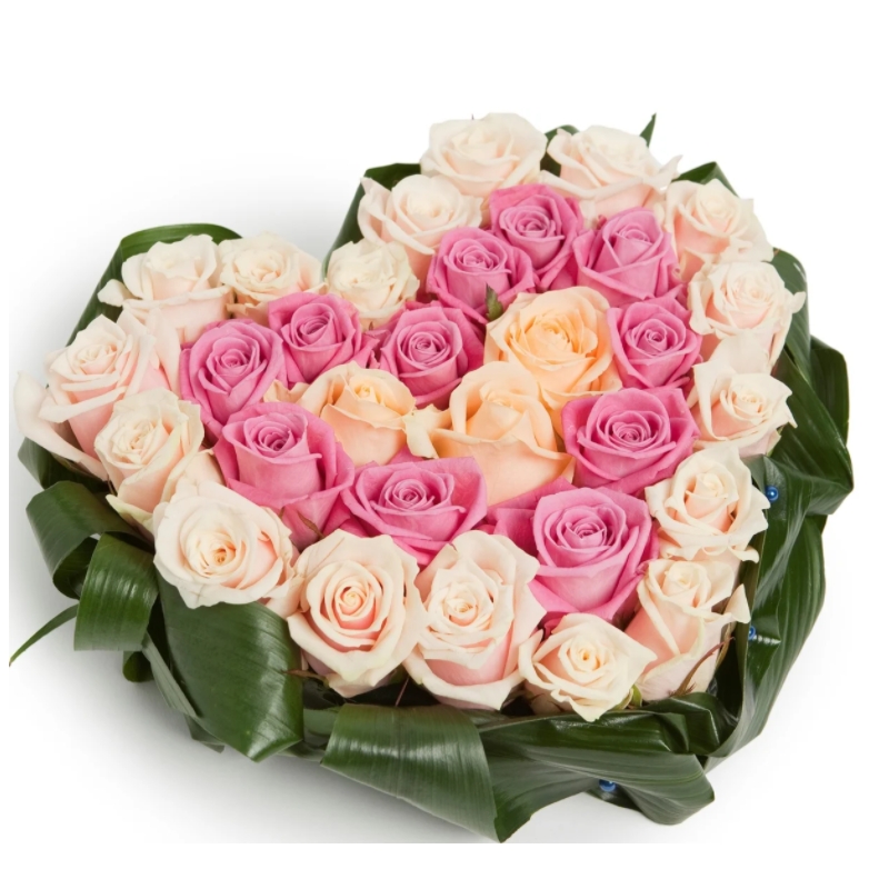 Сердце из 31 кремовой и розовой розы