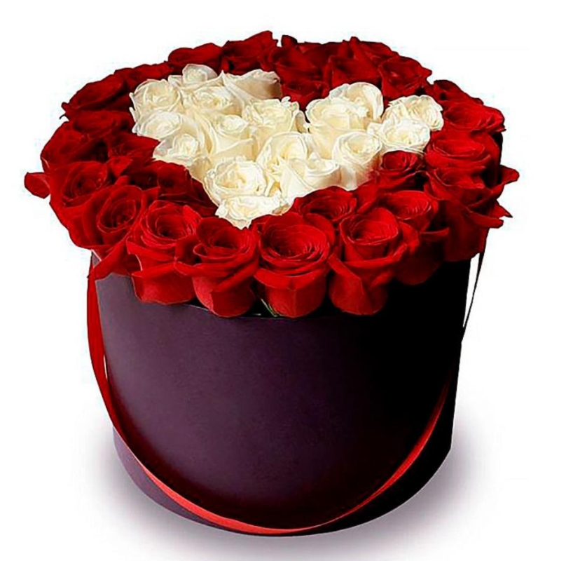 Сердце из 45 белых и красных роз в коробке