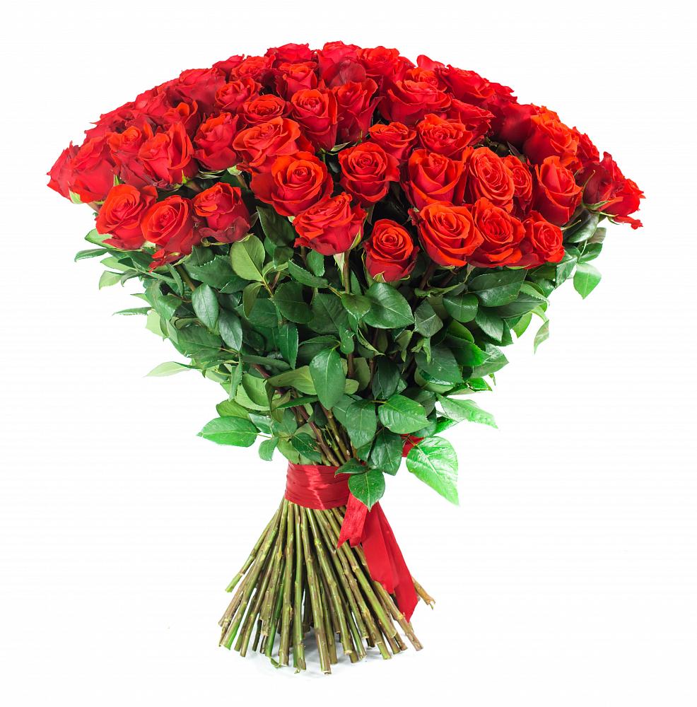 Букет состоит из 75 красных роз, прозрачная упаковка, атласная лента.