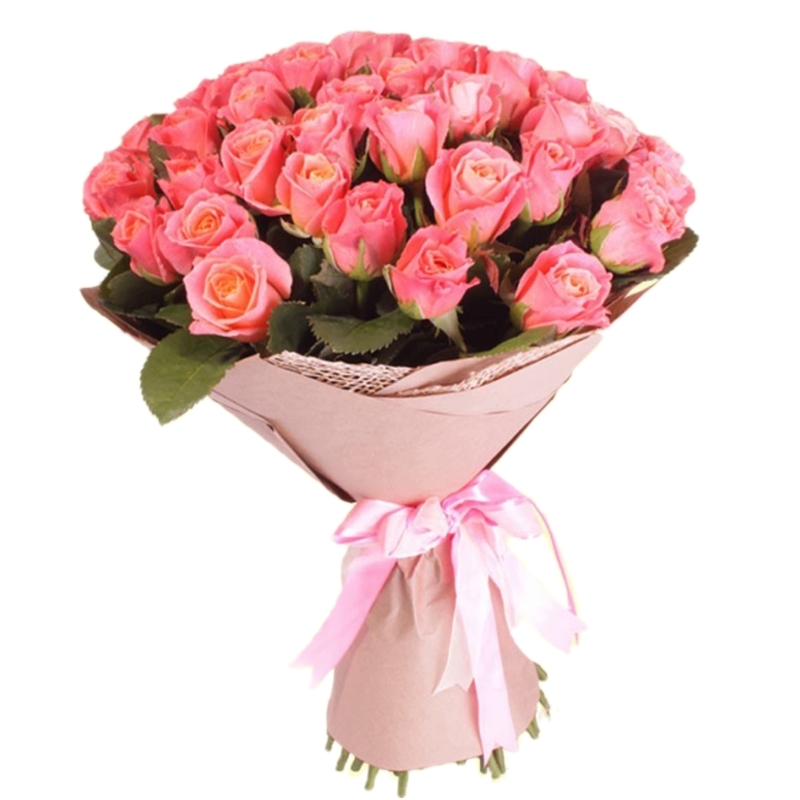 Букет состоит из 45 розовых роз, крафт, атласная лента.