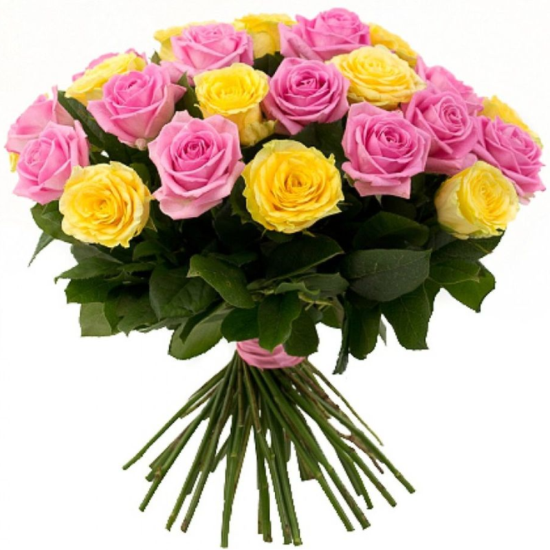 Букет состоит из 23 розовые розы, 22 желтые розы, прозрачная упаковка, атласная лента.