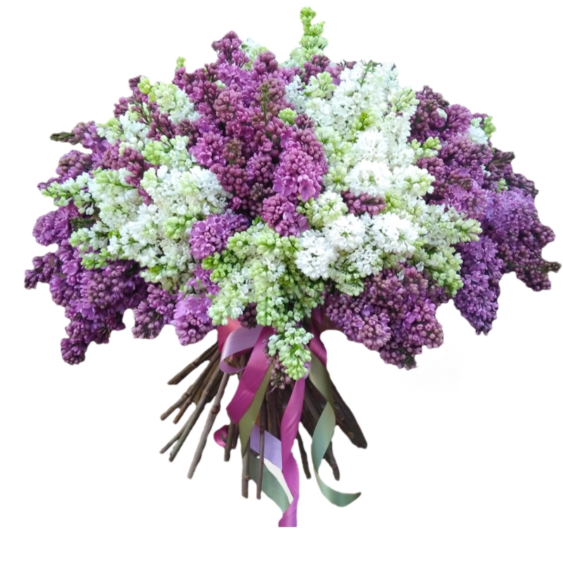 Букет состоит из 45 веток сирени, прозрачная упаковка, атласная лента.