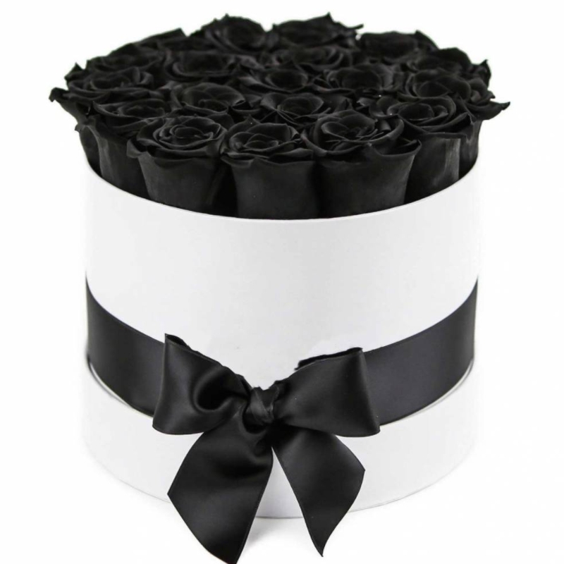 Букет состоит из 25 черных роз, коробка, оазис, атласная лента.